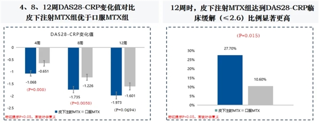 在临床研究中,甲氨蝶呤注射液的疗效通过多个主要和次要终点进行了验证。其中,主要终点是12周DAS28-ESR的变化量,结果显示皮下注射方式相较于口服给药具有显著的优势。此外,次要终点包括4、8、12周的DAS28-CRP变化值以及ACR20、ACR50、ACR70应答率,均表明了皮下注射方式的快速响应和疗效。