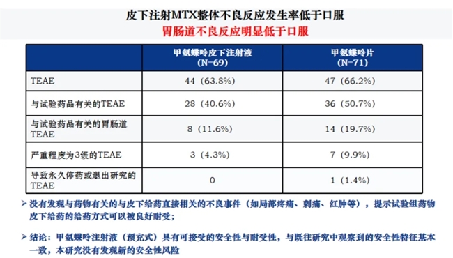 甲氨蝶呤注射液相较于口服MTX有更低的副作用,尤其胃肠道不良反应较少,在疗效、良好的安全耐受性和依从性之间取得了更大的平衡。