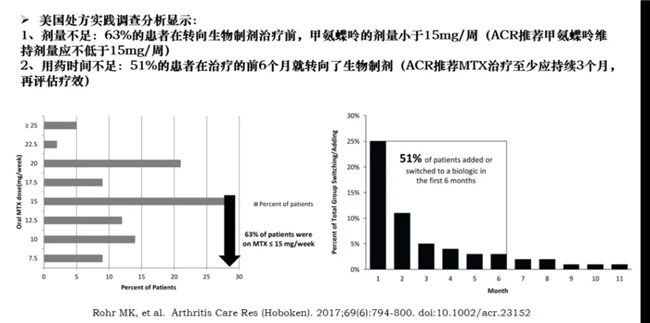 作为有效的一线治疗方案,MTX对于控制病情进展、改善患者生活质量具有重要意义。但长期以来,MTX在临床上并未被充分利用。美国处方实践调查分析显示:剂量不足和用药时间不足,影响了MTX在治疗RA的作用。