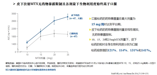甲氨蝶呤注射液产品采用皮下给药,药效更佳。如前述美国处方实践调查分析显示:剂量和用药时间不足,影响MTX的作用。而口服转皮下是提升用药效果的重要方法。口服给药的药物暴露量在15mg/周达到平台期,而皮下给药的药物暴露量呈线性增加,无药物暴露限制。